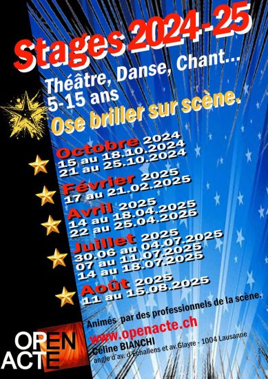 Nous vous proposons ponctuellement des camps de vacances enfants, dès 5 ans, à Lausanne. Il s’agit de semaine d’expression artistique ou votre enfant pourra découvrir les joies des différents arts. Un mini spectacle sera présenté en fin de stage.